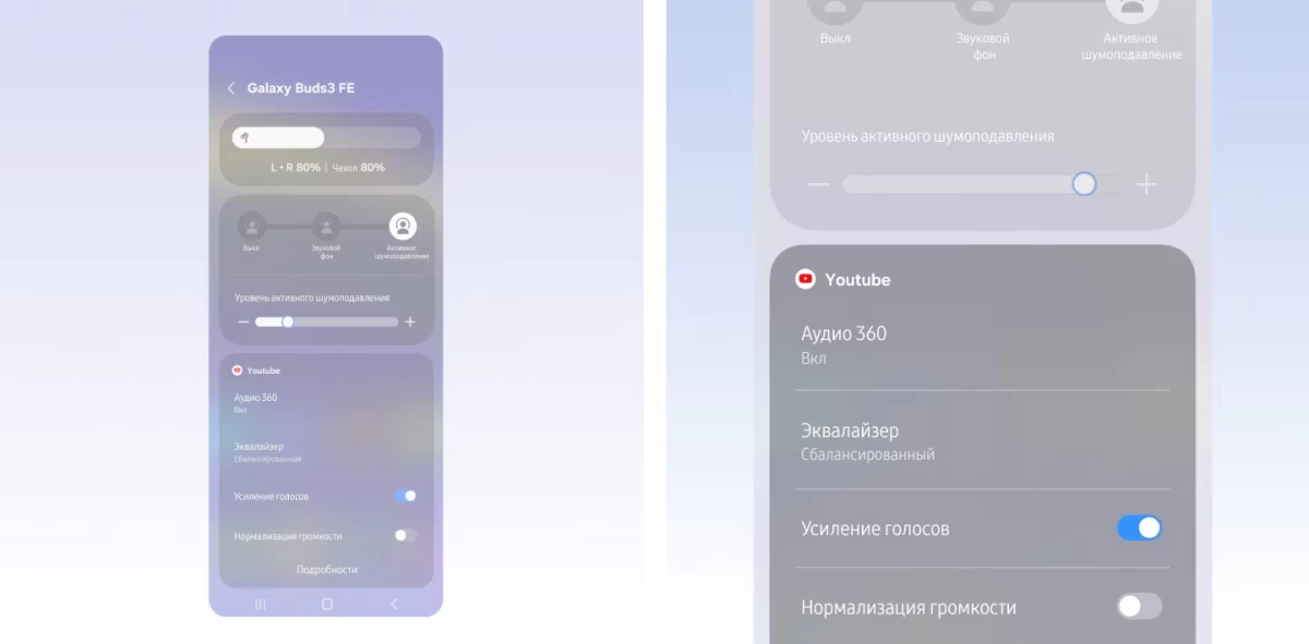 Настраивайте звук во время просмотра потокового видео или работы с другими приложениями. Доступ к ключевым функциям и настройкам Galaxy Buds можно получить прямо с панели быстрого доступа, что упрощает настройку шумоподавления и параметров звука. От настройки эквалайзера в музыкальном приложении до включения 360 Audio для просмотра видео: вы можете установить и сохранить настройки звука для каждого приложения, чтобы обеспечить гармоничное звучание по своему вкусу.